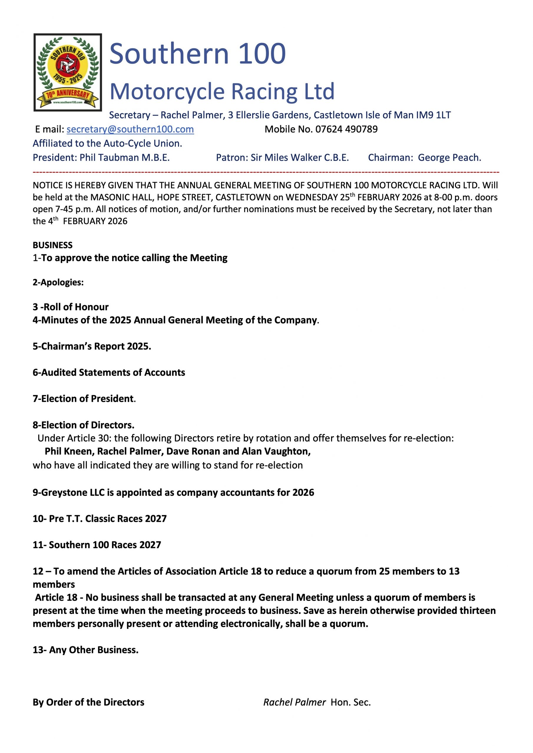 Notice is hereby given that the Annual General Meeting of the Southern 100 Motorcycle Racing Ltd will be held at the Masonic Hall, Hope Street, Castletown on Wednesday 25th February at 8pm, doors open 7:45 p.m. All notices of motion, and/or further nominations must be received by the Secretary, not later than the 4th February 2026.