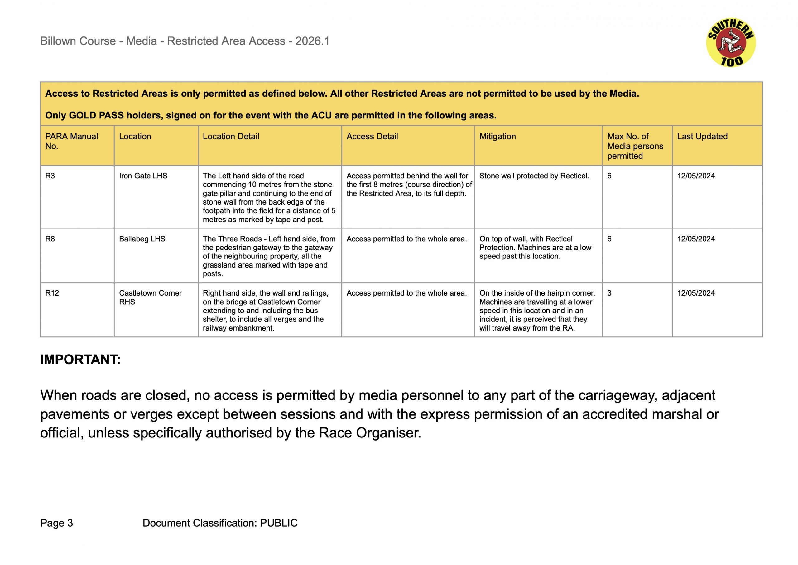 All press registering for the Blackford’s Pre-TT Classic Road Races, and / or the Isle of Man Steam Packet Company Southern 100 Road Races will be required to sign a form acknowledging that they adhere to Southern 100 Motorcycle Racing Club Ltd requirements on legal liability insurance and course familiarity.