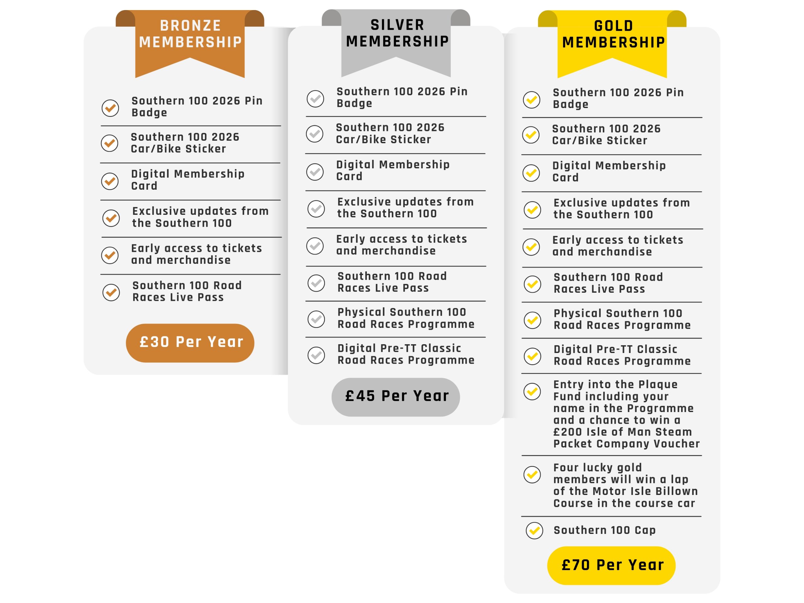 Supporter Membership is available in three tiers for the 2026 season. For those wishing to join the Southern 100 Club, either as a rider or as a supporter without membership benefits a £15 membership is also available.